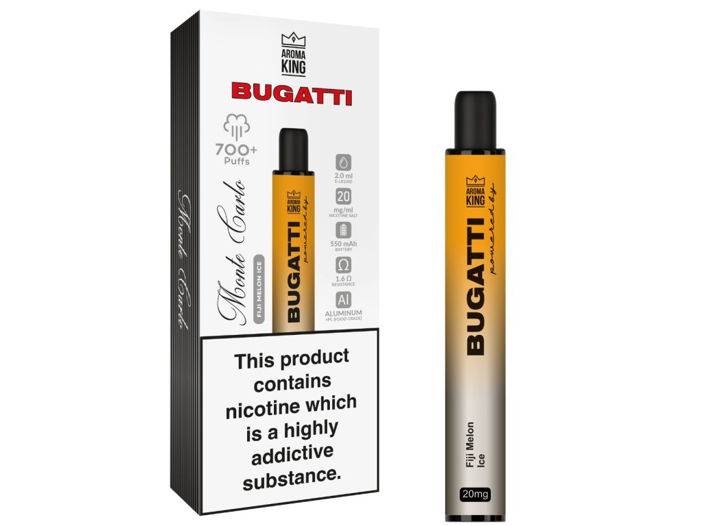 Jednorázová e-cigareta Aroma King Bugatti Monte Carlo Fiji Melon Ice kombinuje sladkost melounu z Fiji s osvěžujícím ledovým nádechem a vytváří harmonickou tropickou směs.