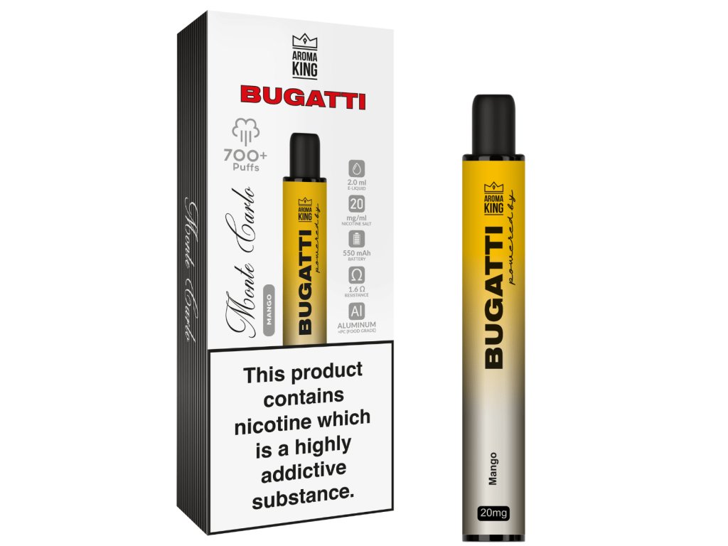 Jednorázová e-cigareta Aroma King Bugatti Monte Carlo s osvěžující příchutí exotického a sladkého manga.