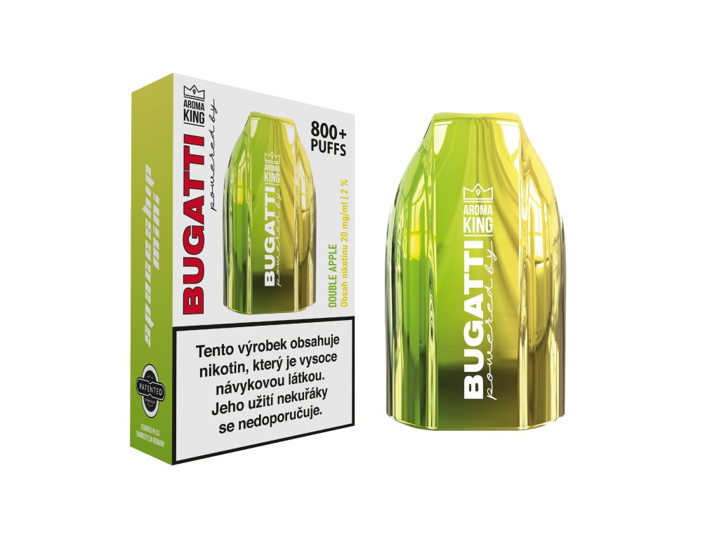 Jednorázová e-cigareta Aroma King Bugatti Spaceship Mini Double Apple se šťavnatou chutí kombinující kyselé zelené a sladké červené jablko.