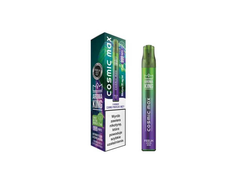 Jednorázová e-cigareta Aroma King Cosmic Max 999 Blackcurrant Mint nabízí lahodnou chuť máty a černého rybízu, které uspokojí vaše chuťové buňky, podpoří relaxaci a dodá energii po celý den.