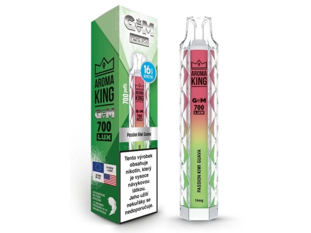 Vyzkoušejte naší jednorázovou e-cigaretu Aroma King Gem Lux 700 s příchutí Passion Kiwi Guava spojuje neodolatelné chutě kiwi, marakuji a guavy, aby vytvořila osvěžující a exotický zážitek pro uživatele.