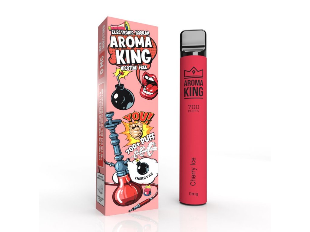 Jednorázová e-cigareta Aroma King Hookah 700+ Cherry Ice se sladkou třešňovou příchutí a ledovým podtónem.